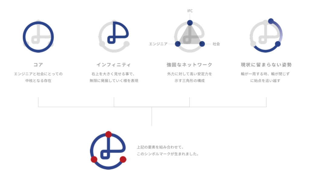 シンボルマークは、「コア」「インフィニティ」「ネットワーク」「現状に留まらない姿勢」を表現し、シンボルマーク上の3つの赤い点は、「IFC」を始点として「エンジニア」を通じ、「社会」への未来的な繋がりと広がりを示しています。