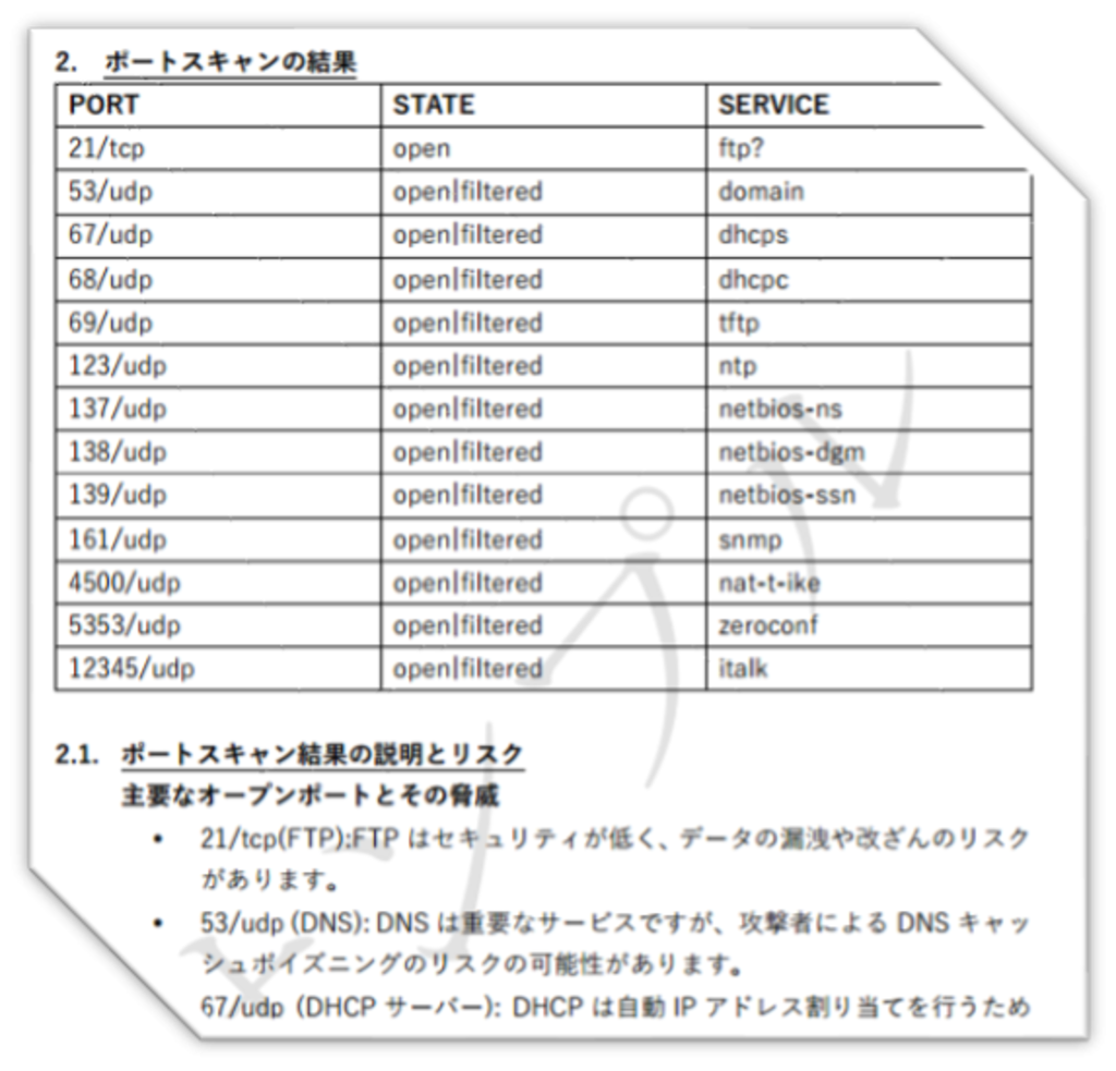ポートスキャンは後日詳細レポートにて1,000+のポートをチェックした結果を送付します。